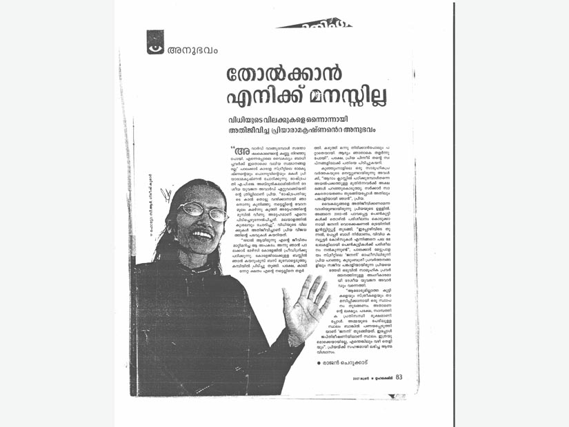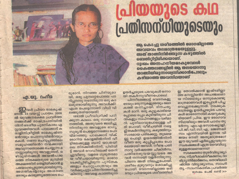 Priya was born and raised at Palakkad. In the year 1993, while pursuing her pre-degree, Priya met with an accident. She was trying to get into a bus when it sped off leaving Priya on the road with a lifelong injury. She was diagnosed with a loco motor disability. Priya was bed-ridden for months and was unable to move out of the bed. Those who came to visit her had words of sympathy which angered her more.